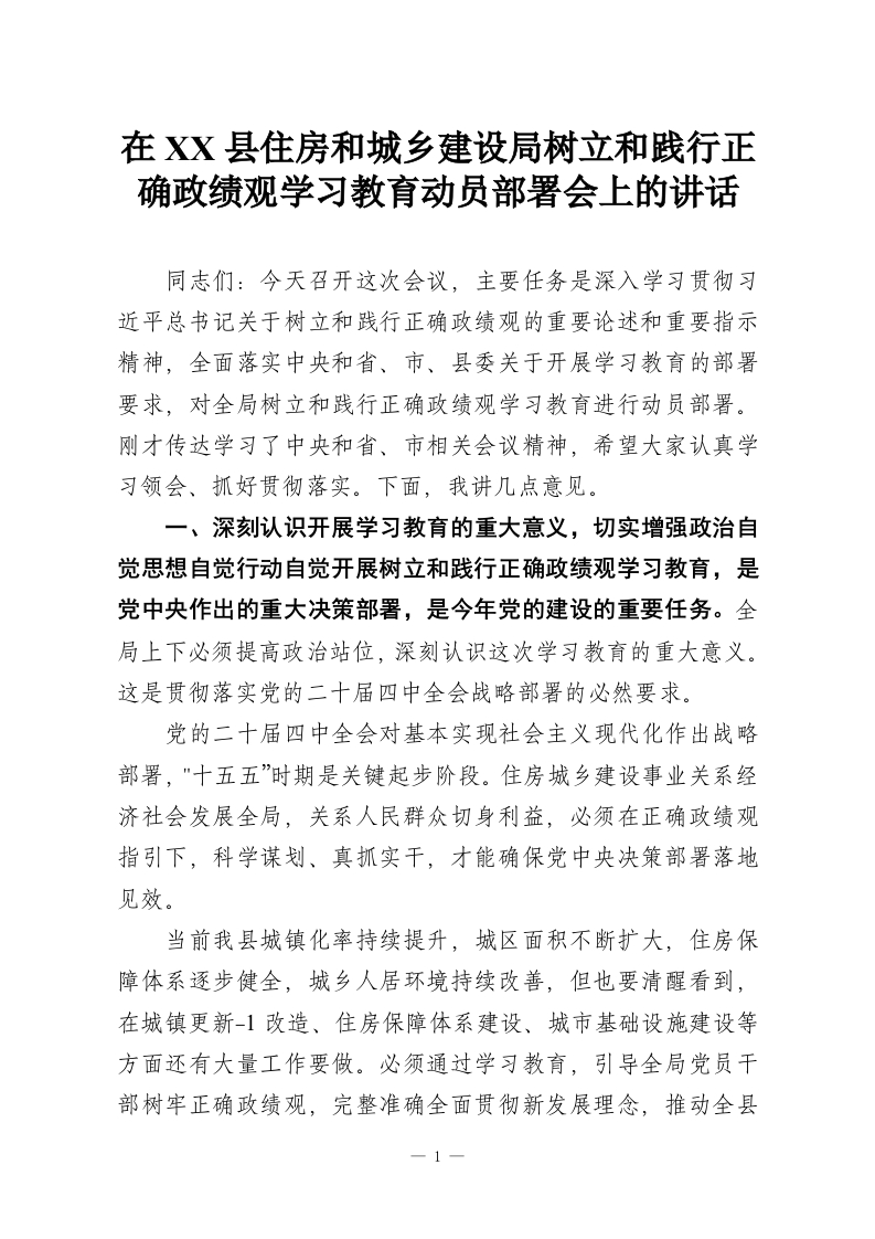 - 在XX县民政局树立和践行正确政绩观学习教育动员部署会上的讲话