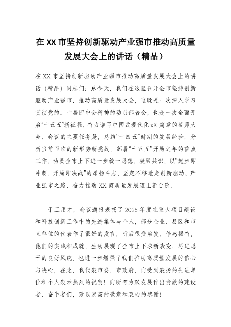 - 在XX市坚持创新驱动产业强市推动高质量发展大会上的讲话