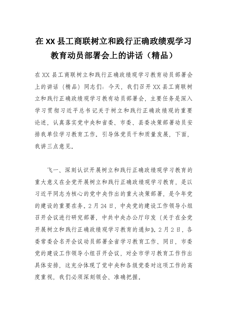 - 在XX县文联开展树立和践行正确政绩观学习教育动员部署会上的讲话(精品)