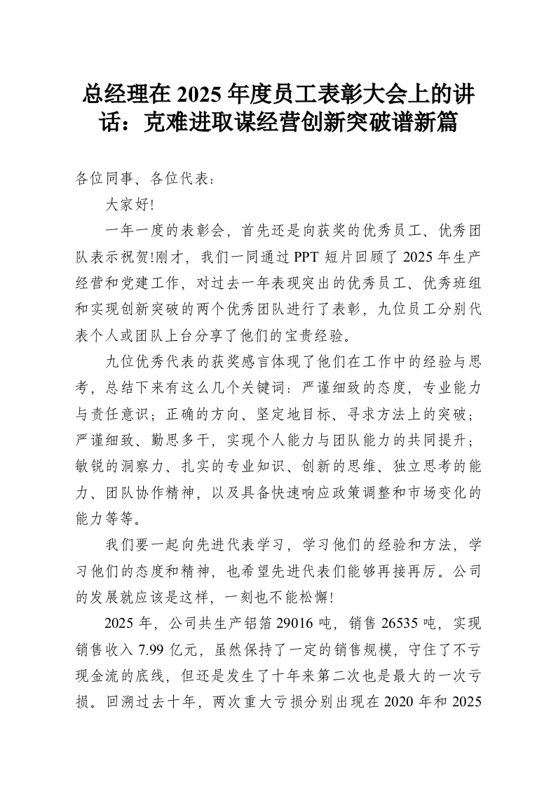 - 总经理在2025年度员工表彰大会上的讲话:克难进取谋经营创新突破谱新篇