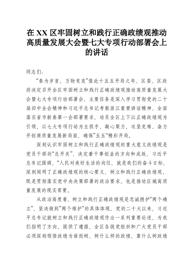 在XX区牢固树立和践行正确政绩观推动高质量发展大会暨七大专项行动部署会上的讲话