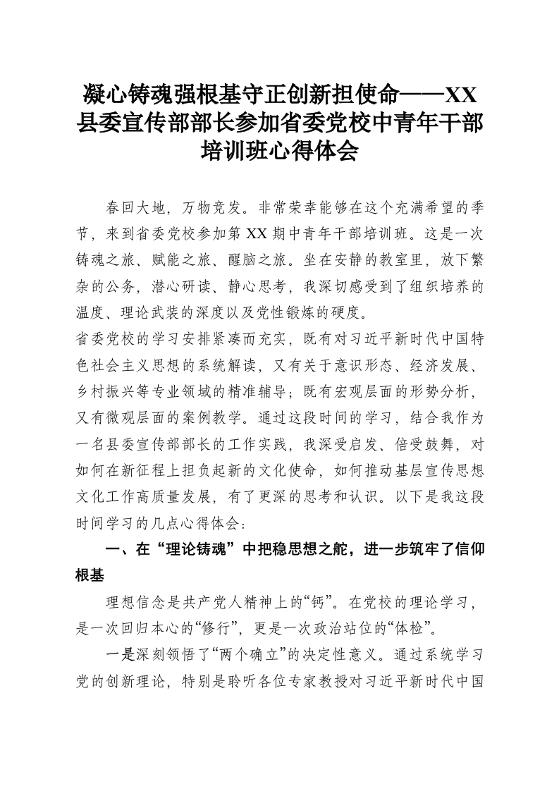 - 凝心铸魂强根基 守正创新担使命——XX县委宣传部部长参加省委党校中青年干部培训班心得体会