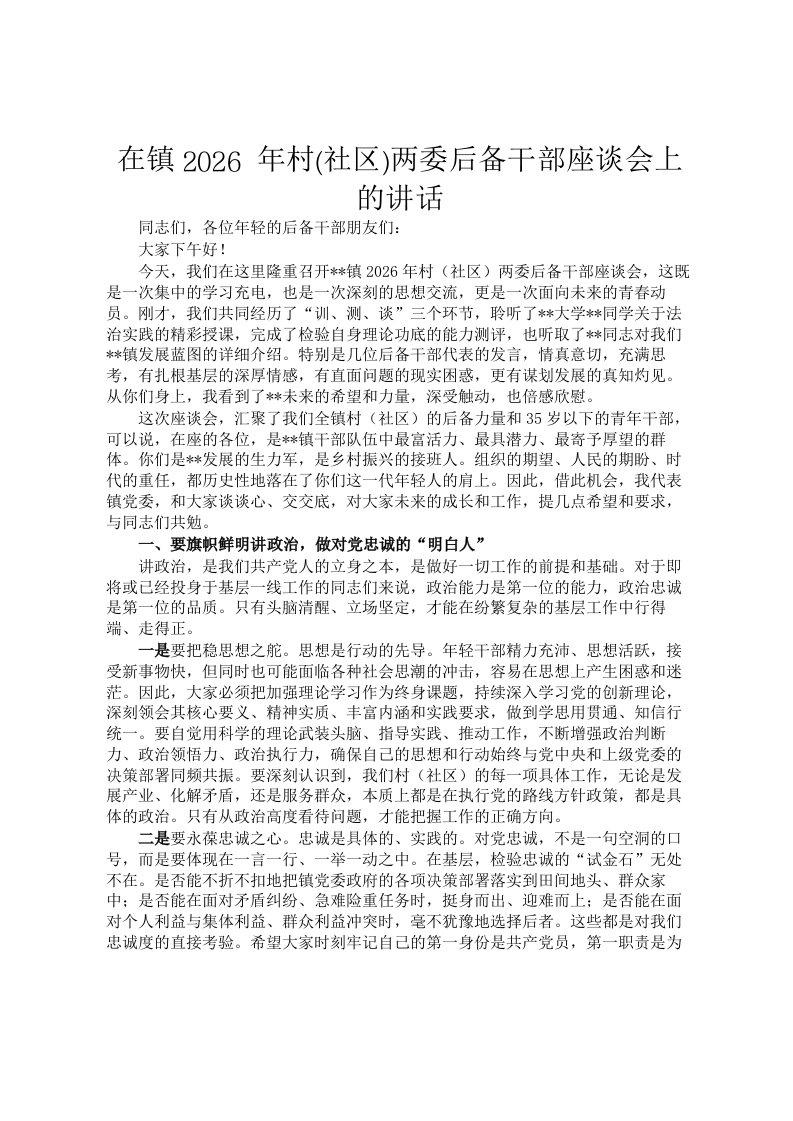 - 在XX镇2026年村(社区)两委后备干部座谈会上的讲话(精品)