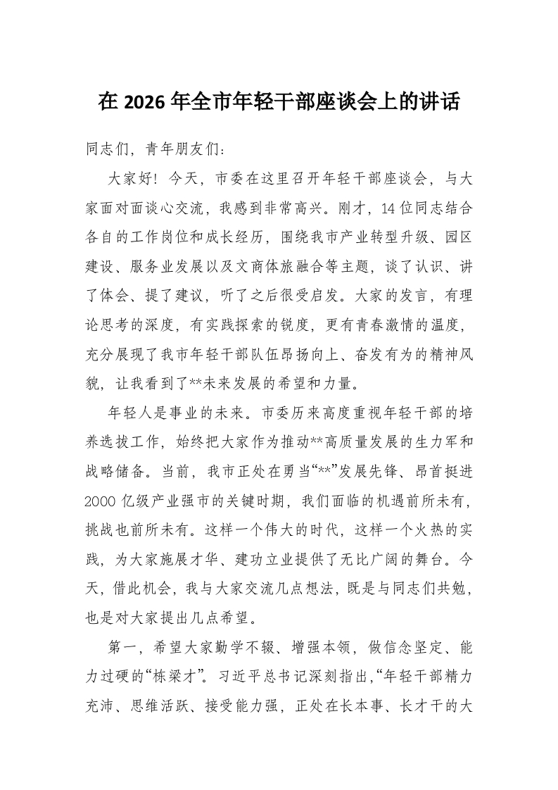 在2026年全市年轻干部座谈会上的讲话