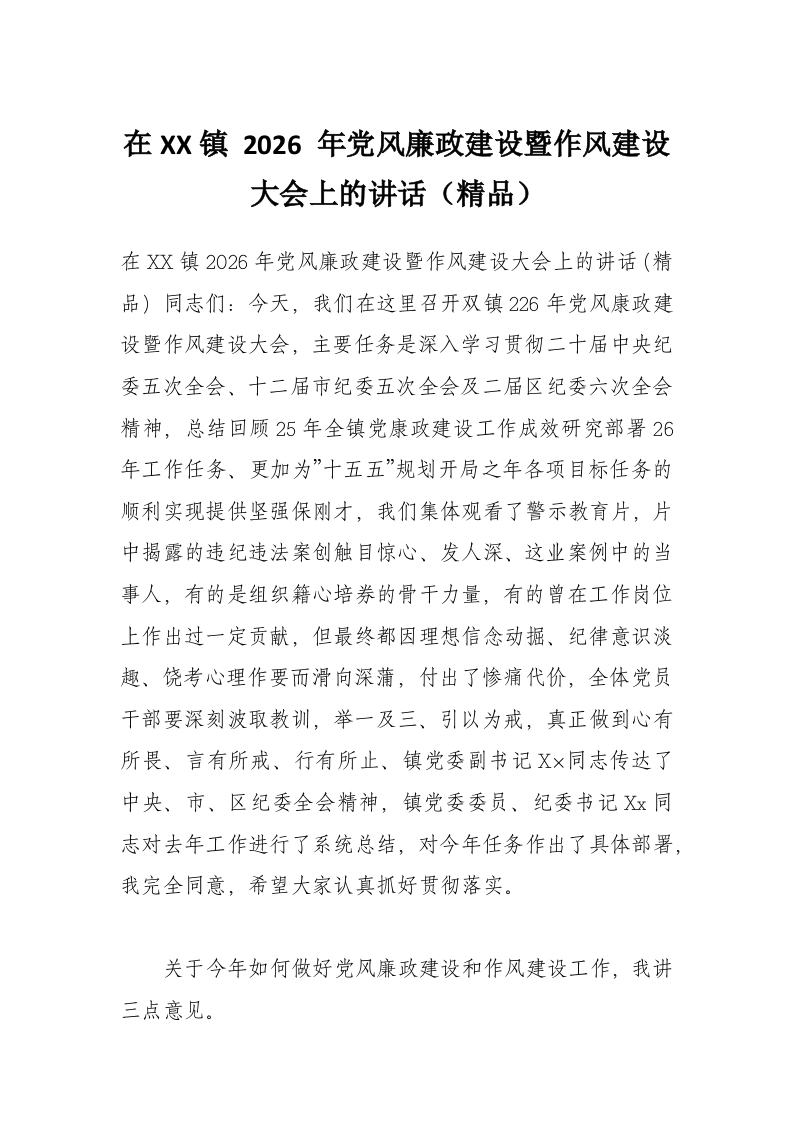 - 在XX镇 2026 年党风廉政建设暨作风建设大会上的讲话(精品)