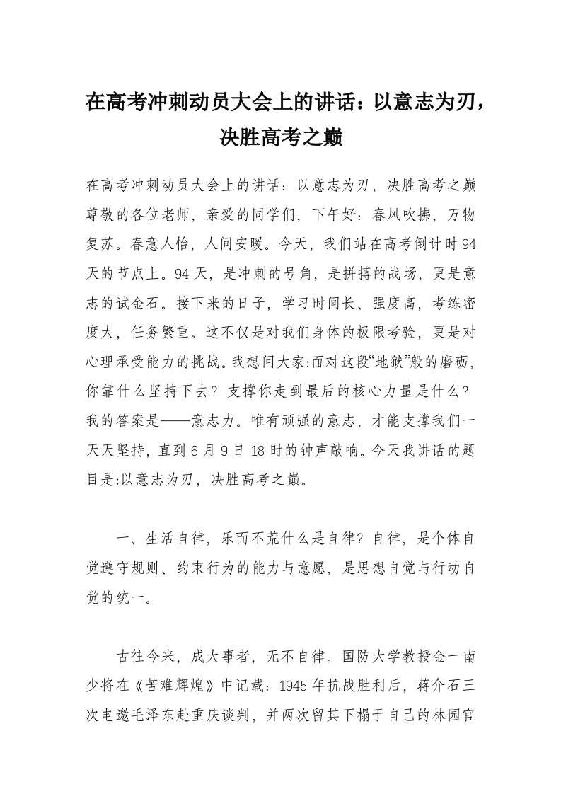 - 在高考冲刺动员大会上的讲话:以意志为刃,决胜高考之巅