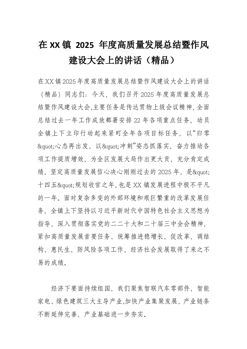 - 在XX镇 2025 年度高质量发展总结暨作风建设大会上的讲话(精品)