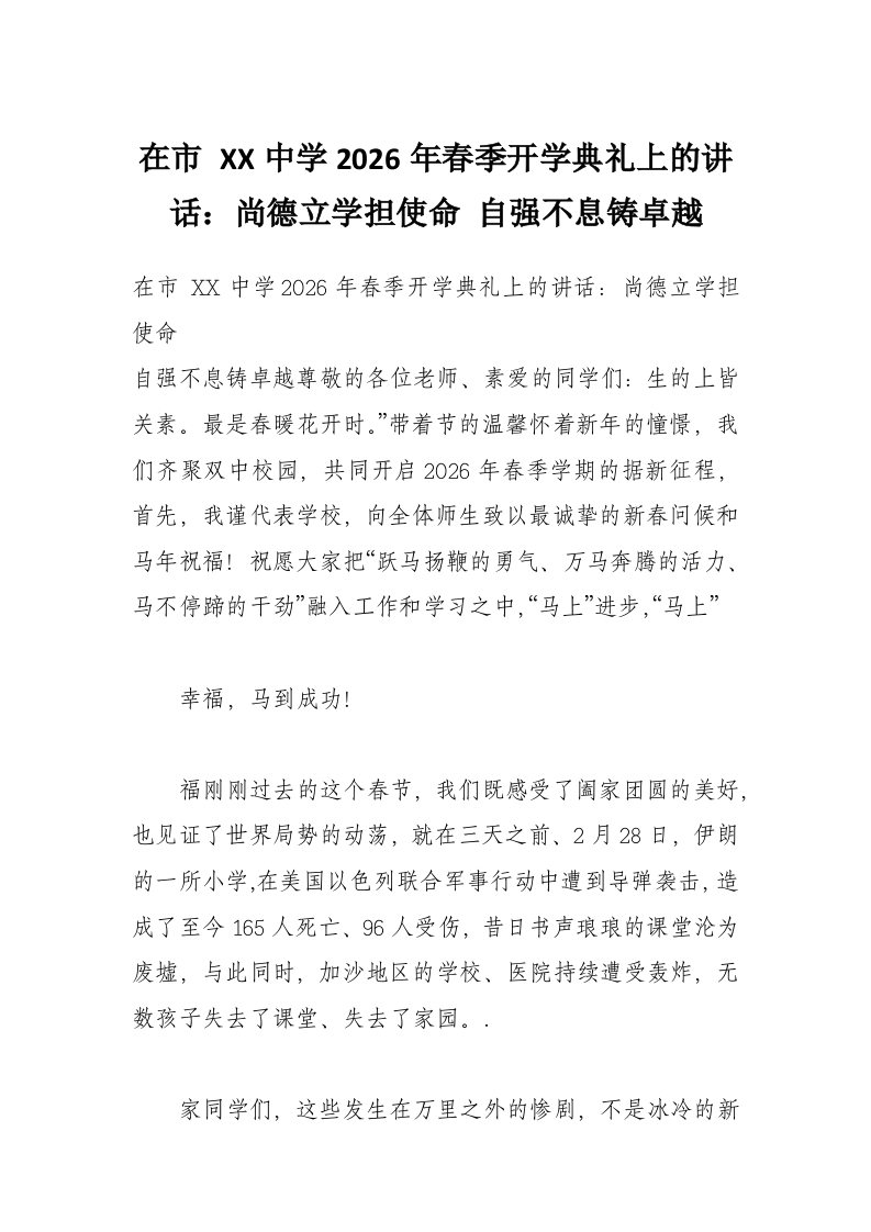 - 在市 XX中学2026年春季开学典礼上的讲话:尚德立学担使命 自强不息铸卓越