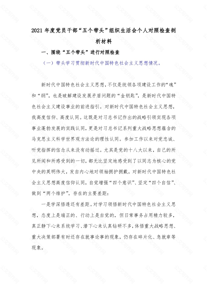 2021年度党员干部“五个带头”组织生活会个人对照检查剖析材料