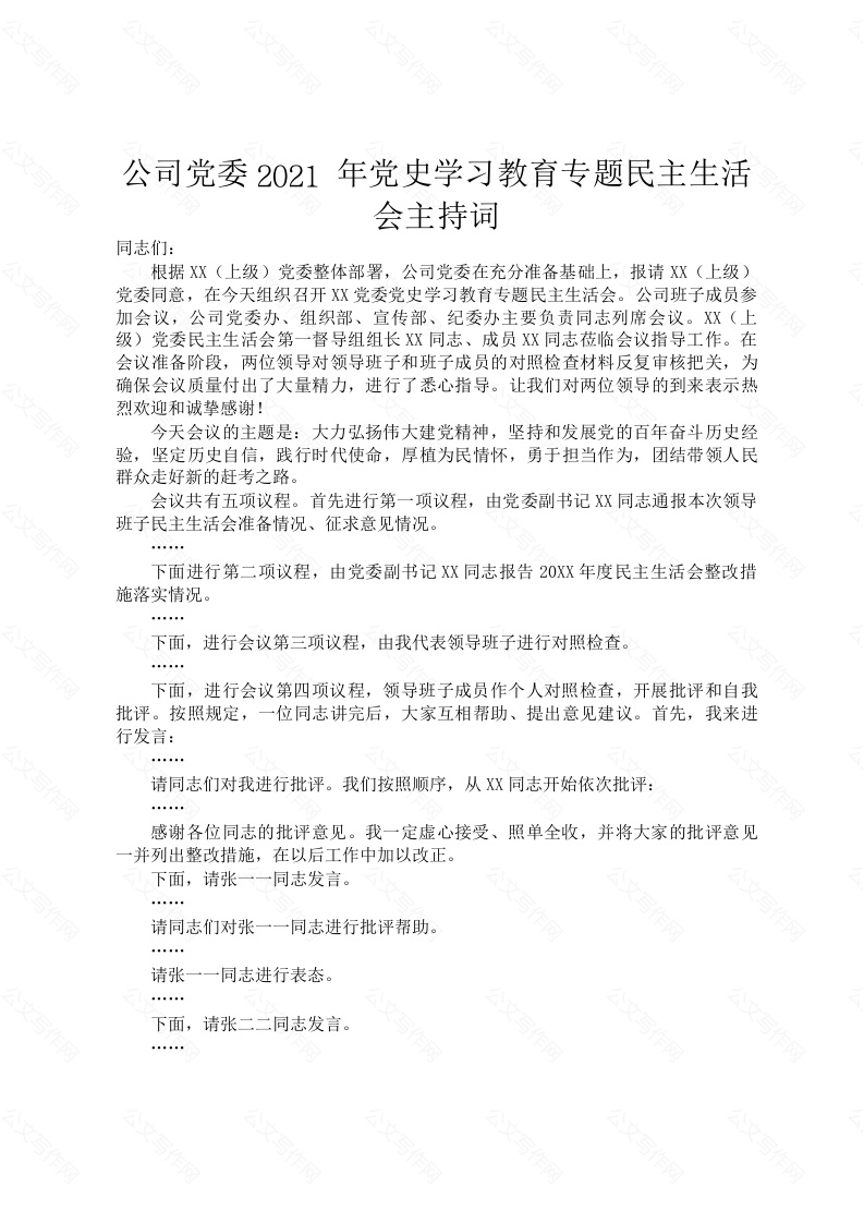 首页精选范文公司党委2021年党史学习教育专题民主生活会主持词