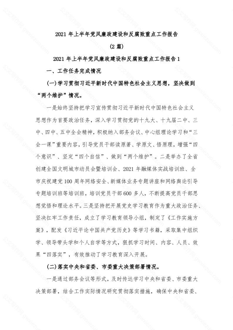 (2篇)2021年上半年党风廉政建设和反腐败重点工作报告
