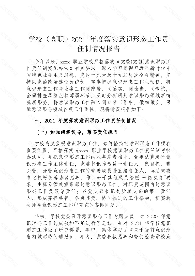 首页精选范文学校(高职)2021年度落实意识形态工作责任制情况报告