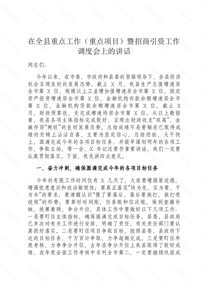 在全县重点工作(重点项目)暨招商引资工作调度会上的讲话