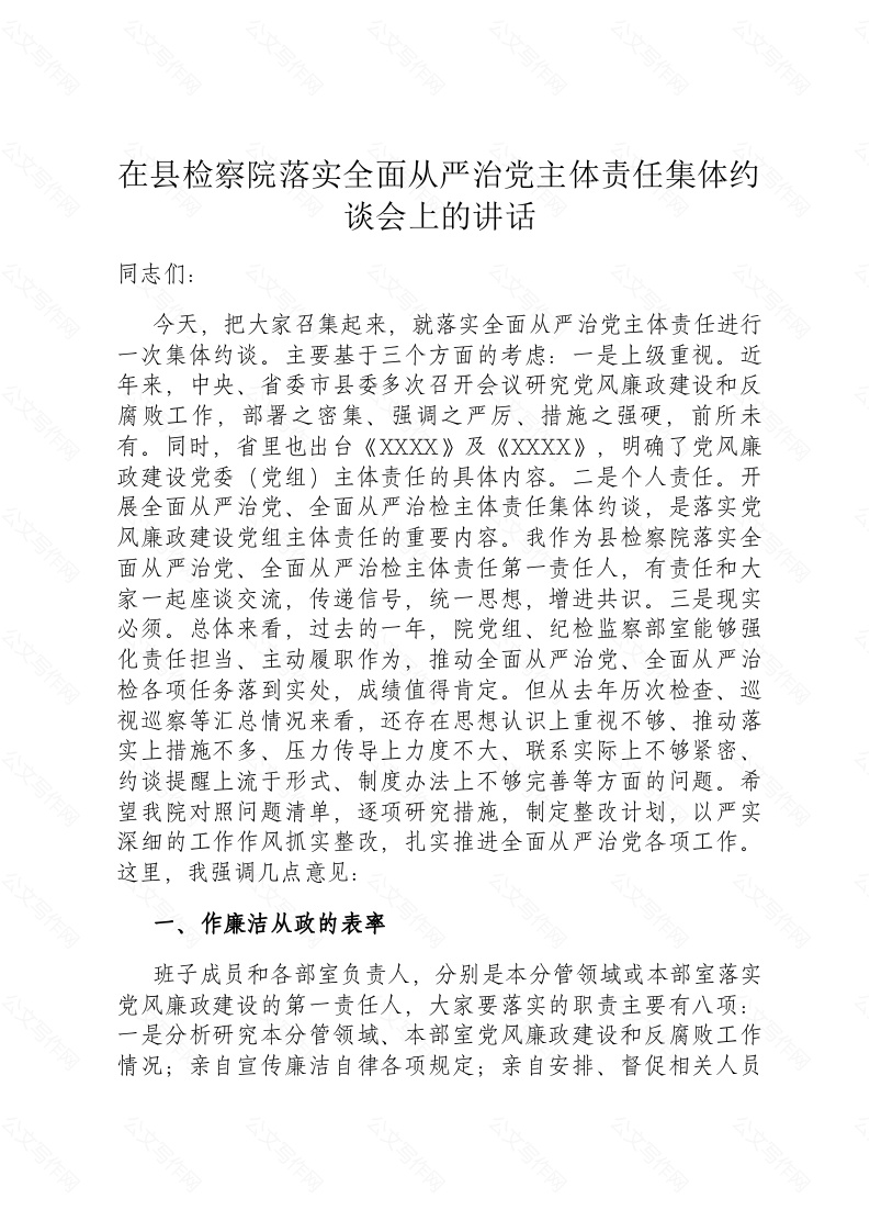 在县检察院落实全面从严治党主体责任集体约谈会上的讲话