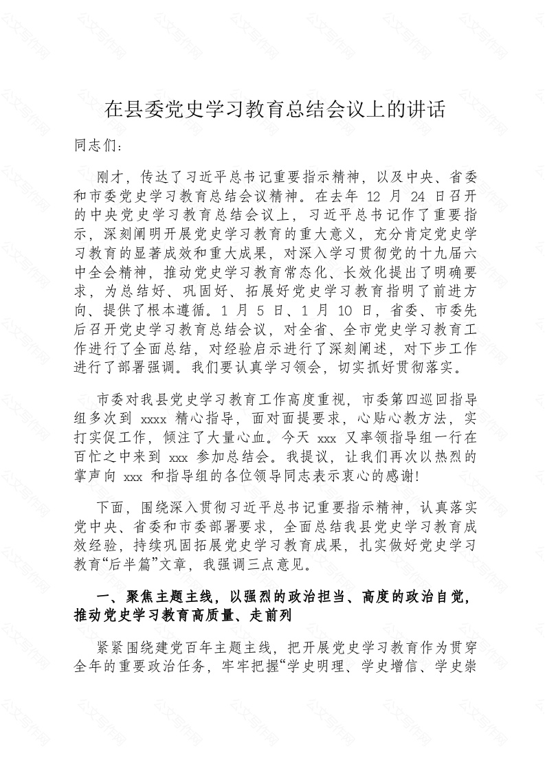 首页精选范文在县委党史学习教育总结会议上的讲话