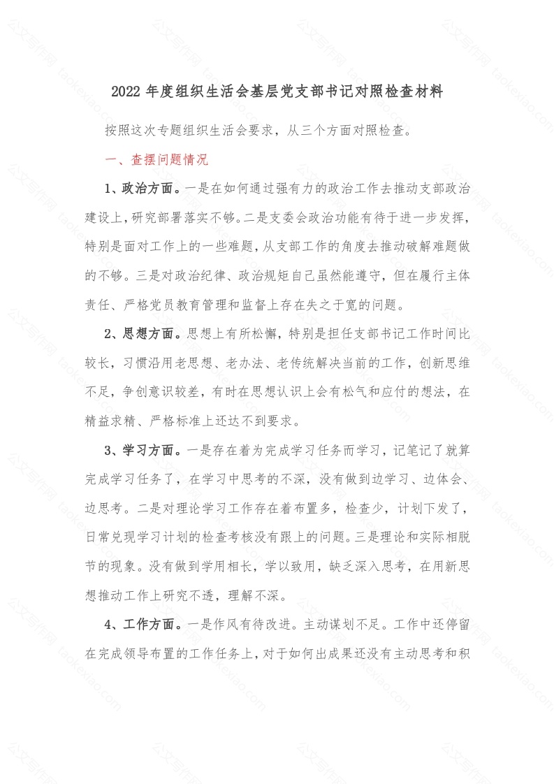 首页工作文档2022年度组织生活会基层党支部书记对照检查材料