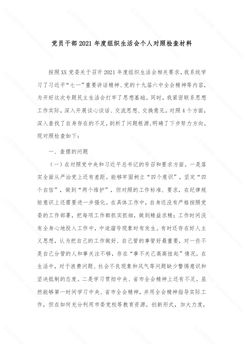 首页学习提升党员干部2021年度组织生活会个人对照检查材料