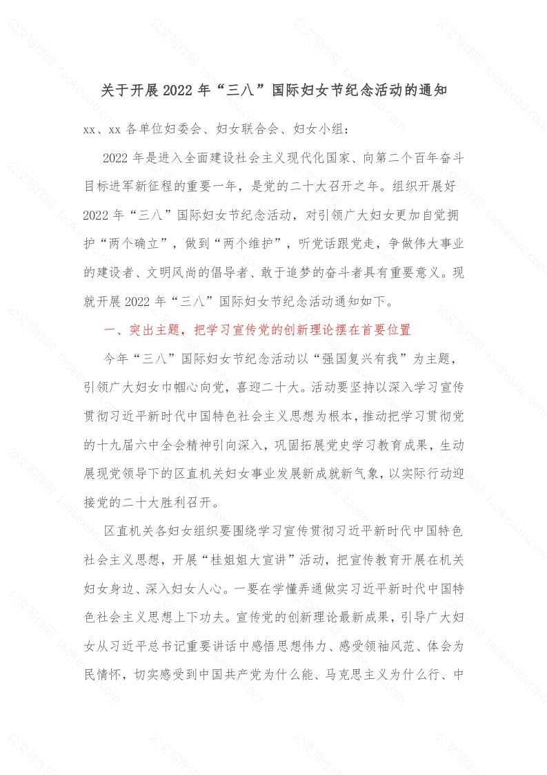 关于开展2022年“三八”国际妇女节纪念活动的通知