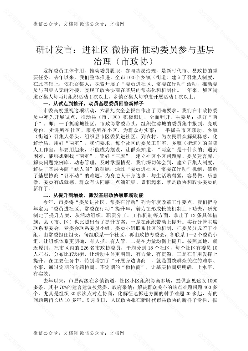 研讨发言:进社区 微协商 推动委员参与基层治理(市政协)
