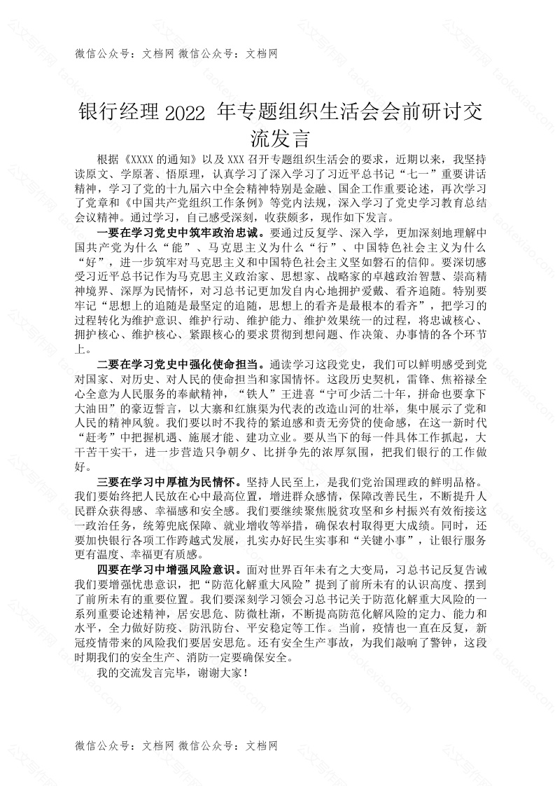 首页讲课讲稿银行经理2022年专题组织生活会会前研讨交流发言