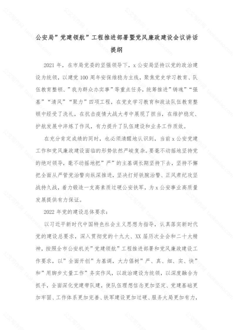 公安局”党建领航”工程推进部署暨党风廉政建设会议讲话提纲