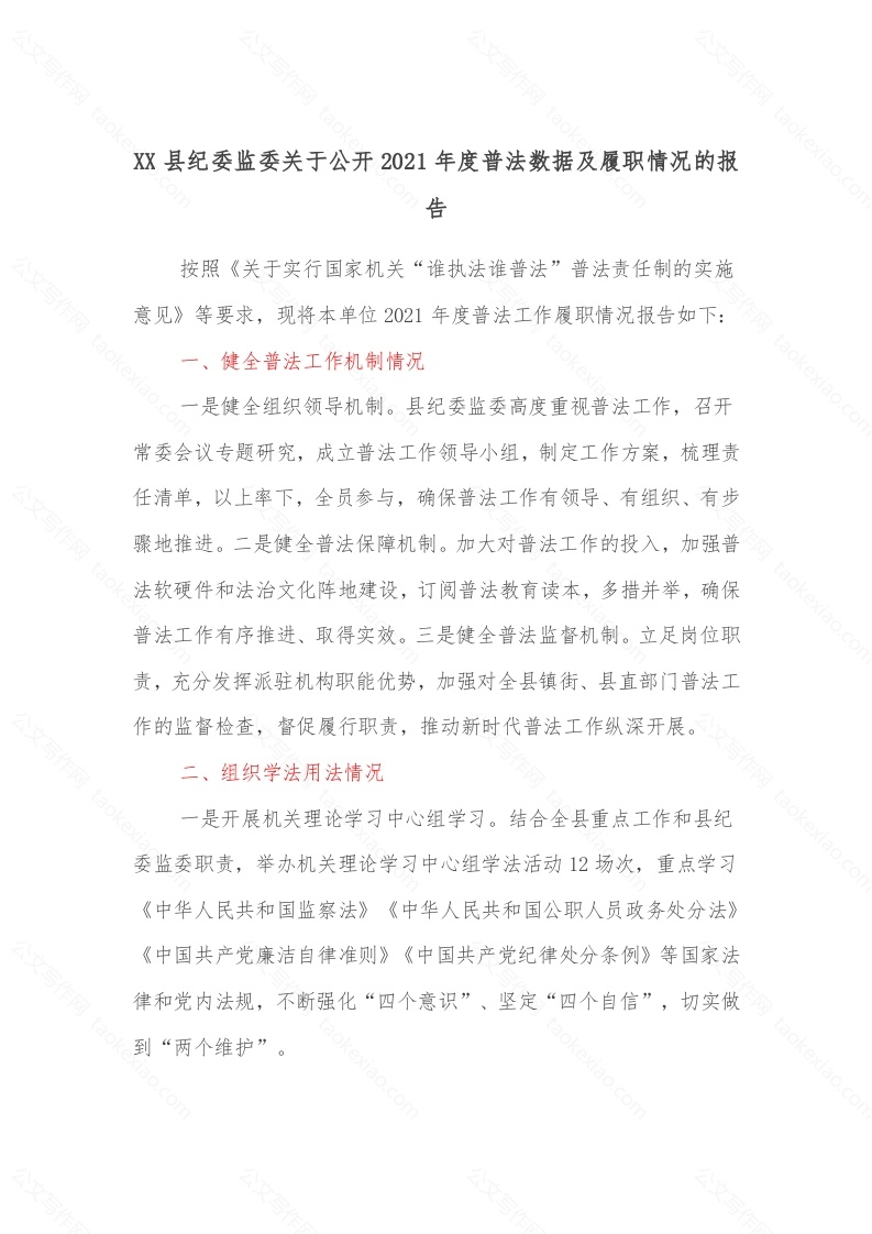 XX县纪委监委关于公开2021年度普法数据及履职情况的报告