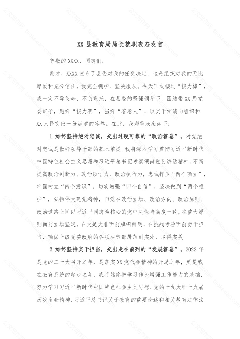 XX县教育局局长就职表态发言