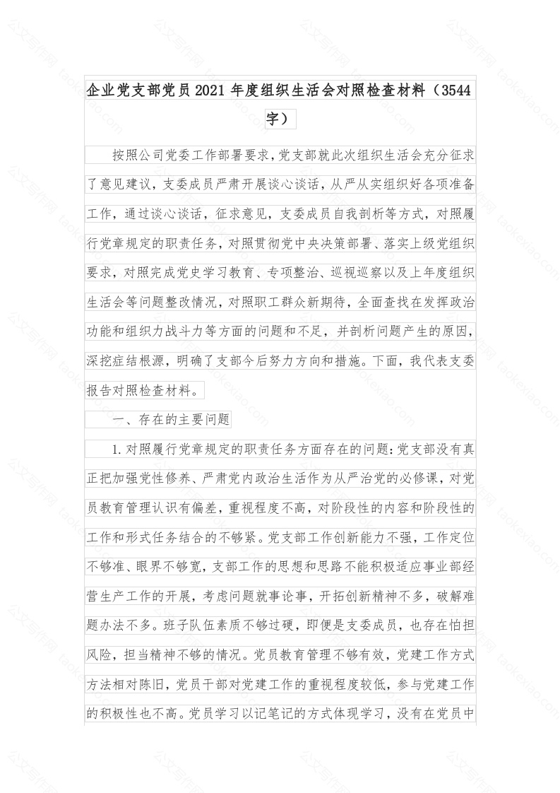 首页写作素材企业党支部党员2021年度组织生活会对照检查材料(3544字)