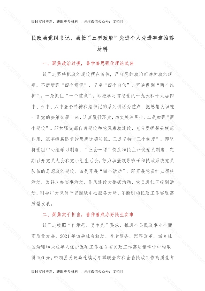 首页材料汇编民政局党组书记、局长“五型政府”先进个人先进事迹推荐材料