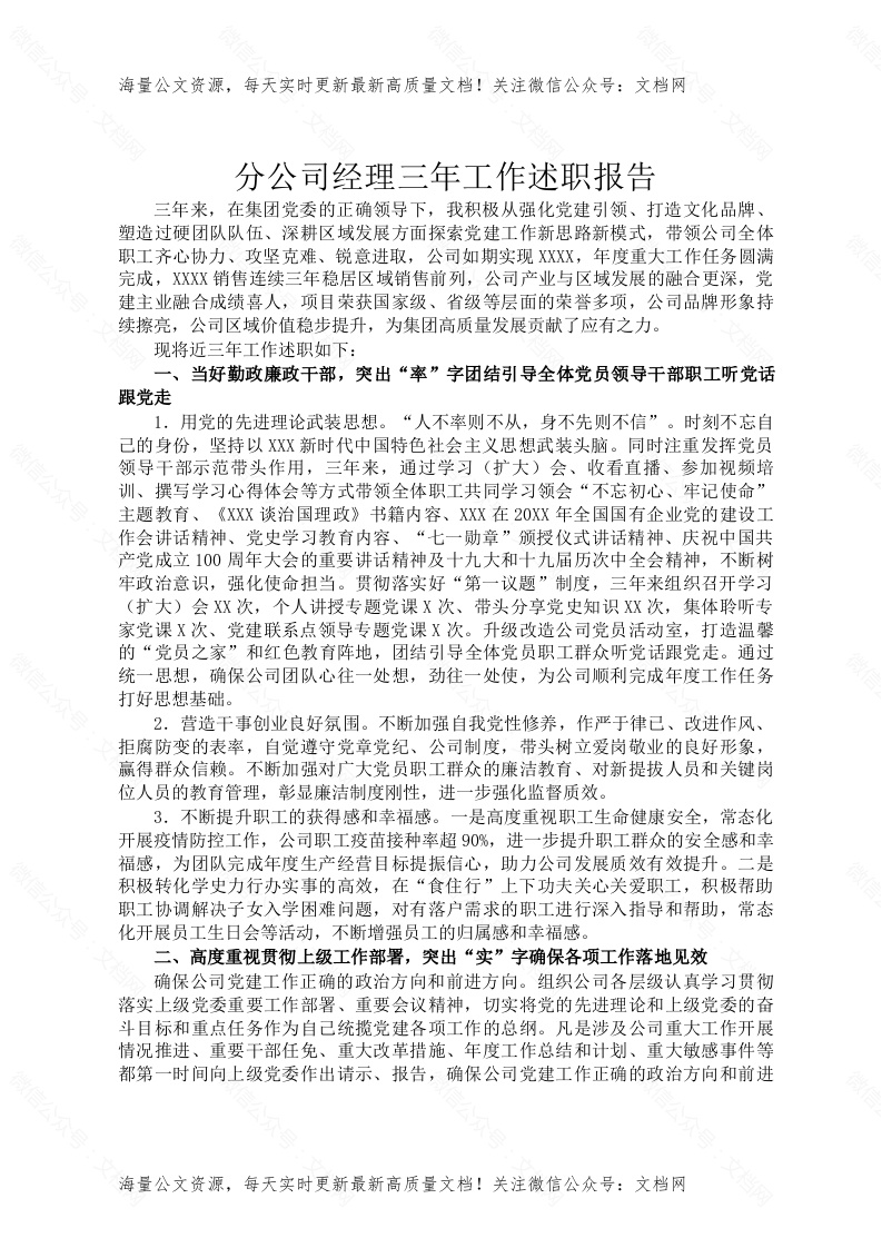 首页工作文档分公司经理三年工作述职报告
