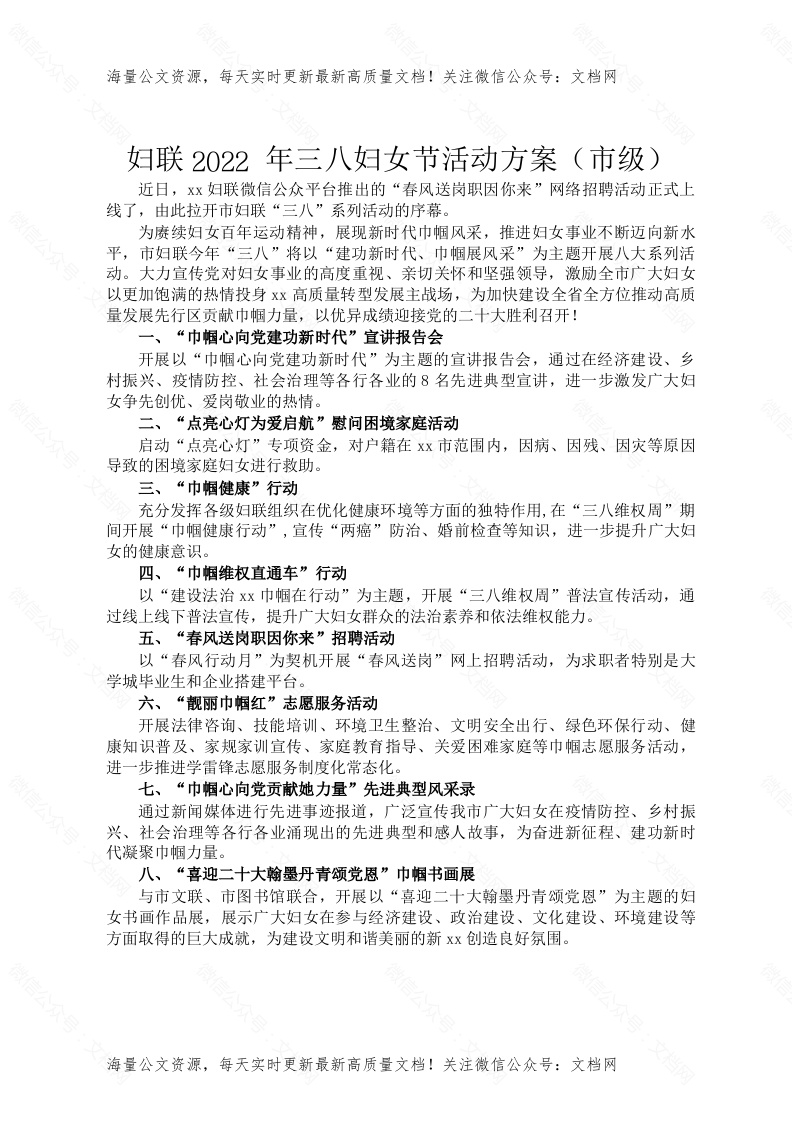 首页工作文档妇联2022年三八妇女节活动方案(市级)