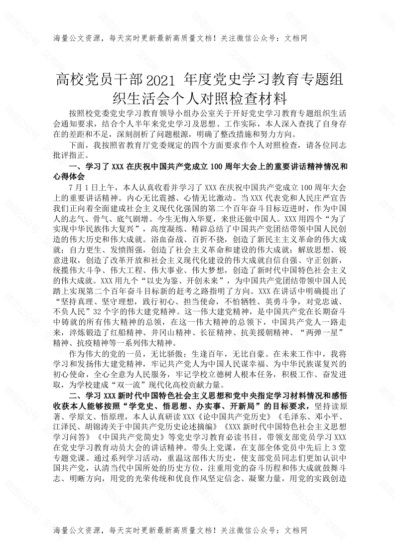 首页工作文档高校党员干部2021年度党史学习教育专题组织生活会个人对照检查材料