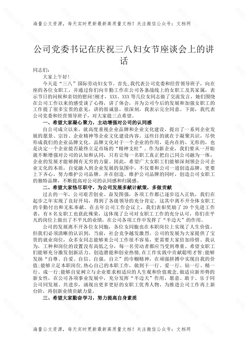 公司党委书记在庆祝三八妇女节座谈会上的讲话