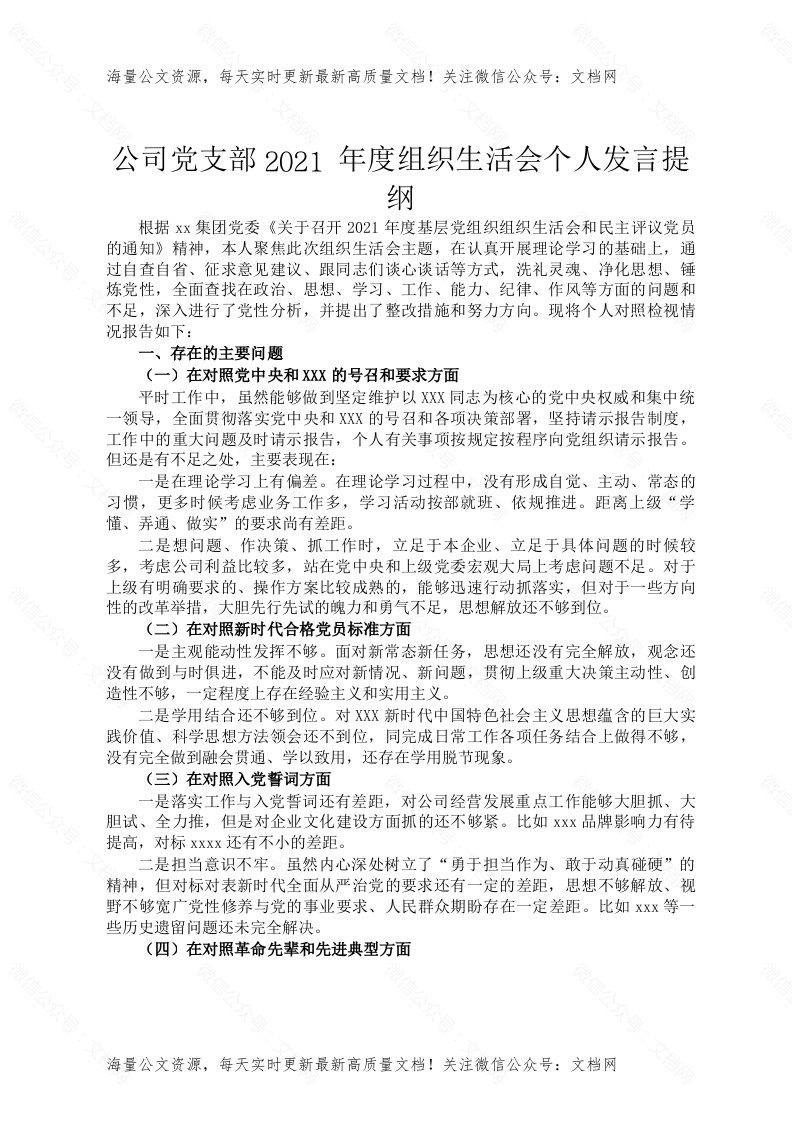 首页工作文档公司党支部2021年度组织生活会个人发言提纲