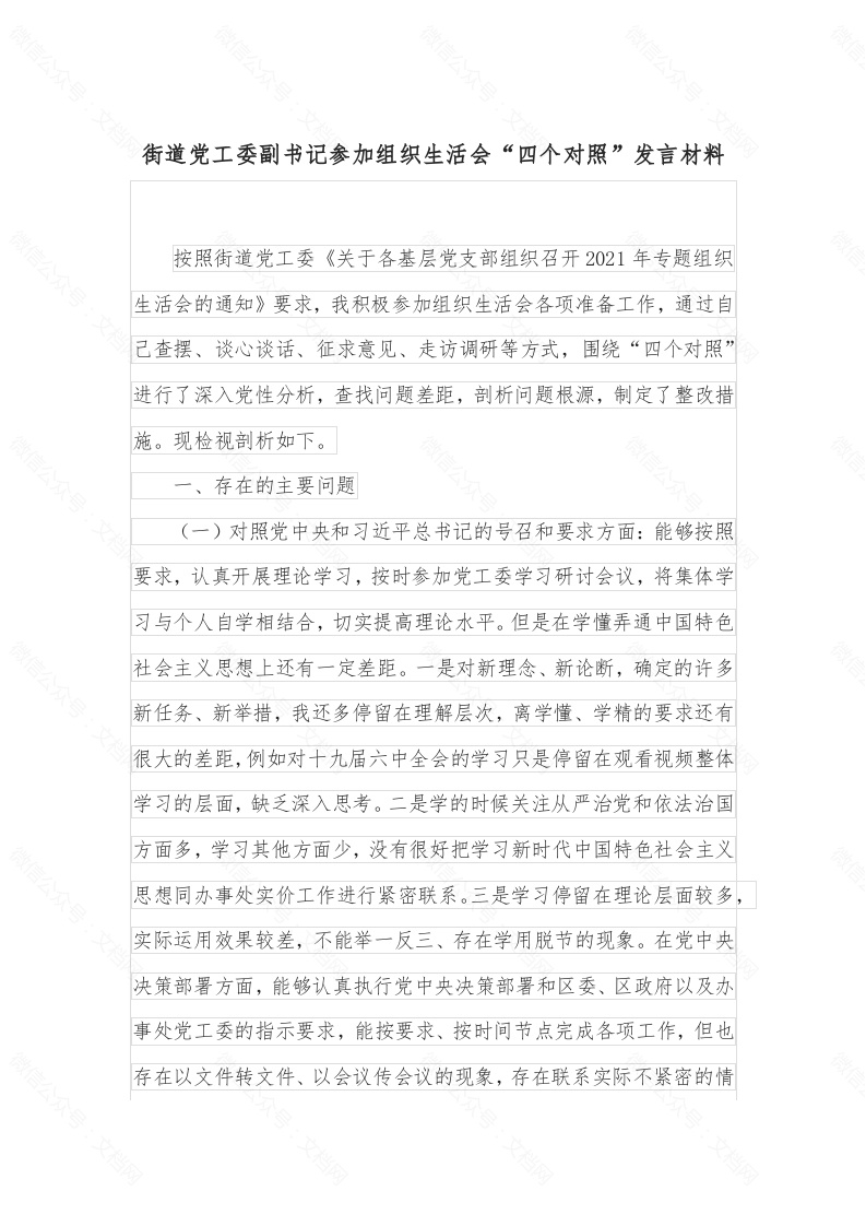 首页工作文档街道党工委副书记参加组织生活会“四个对照”发言材料