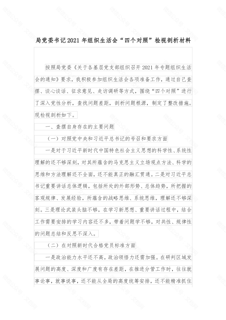 首页工作文档局党委书记2021年组织生活会“四个对照”检视剖析材料