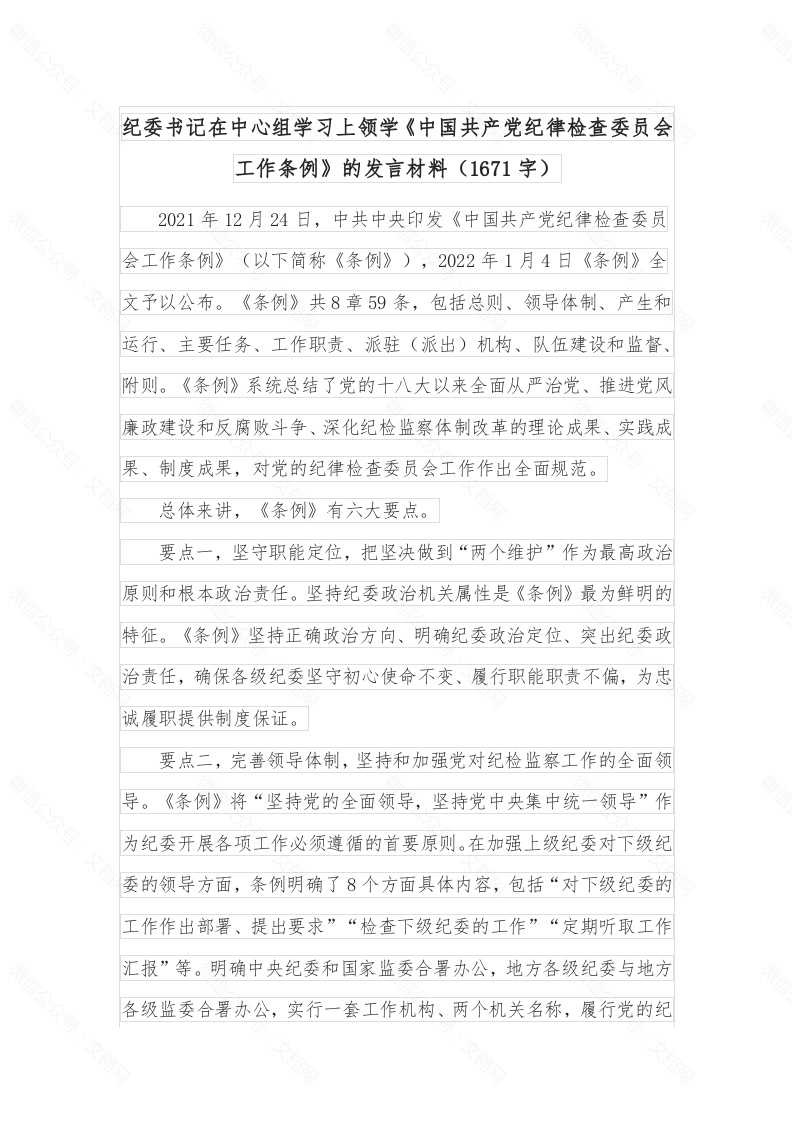纪委书记在中心组学习上领学《中国***纪律检查委员会工作条例》的发言材料(1671字)