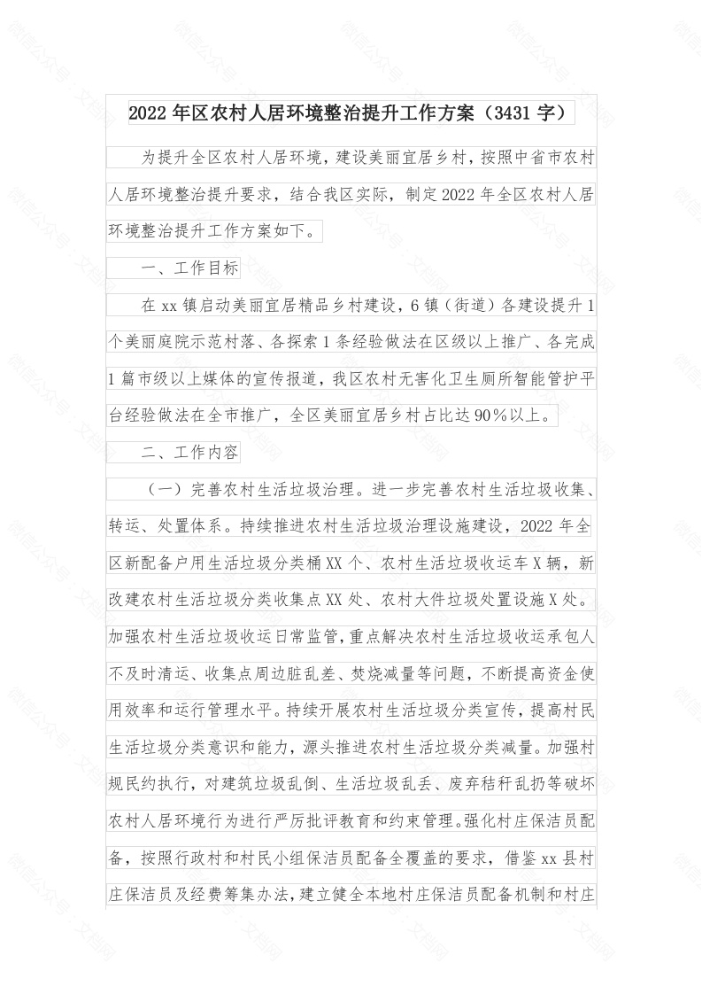某区2022年农村人居环境整治提升工作方案
