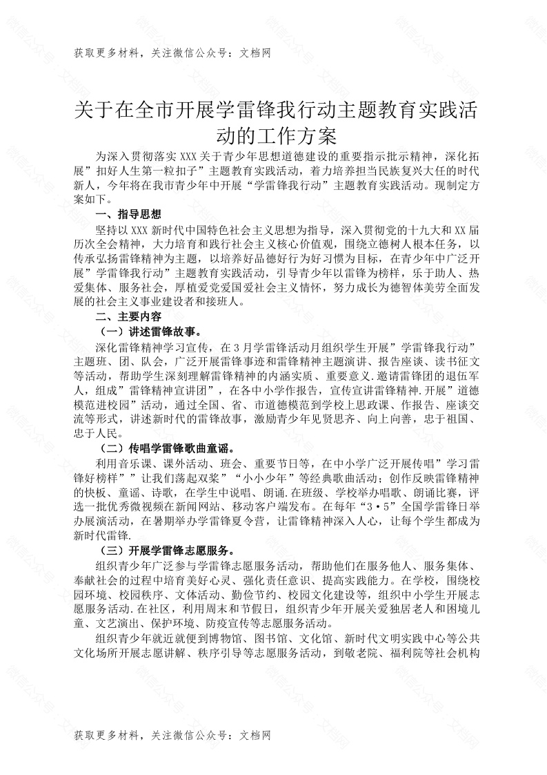 关于在全市开展学雷锋我行动主题教育实践活动的工作方案