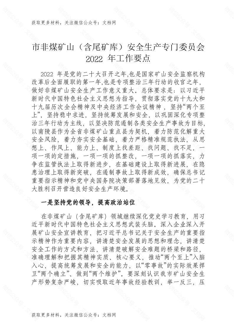 首页讲课讲稿市非煤矿山(含尾矿库)安全生产专门委员会2022年工作要点