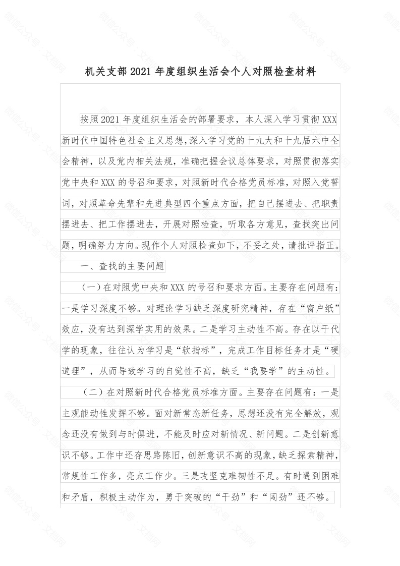 首页工作文档机关支部2021年度组织生活会个人对照检查材料
