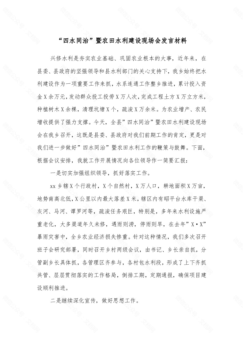 首页工作文档“四水同治”暨农田水利建设现场会发言材料