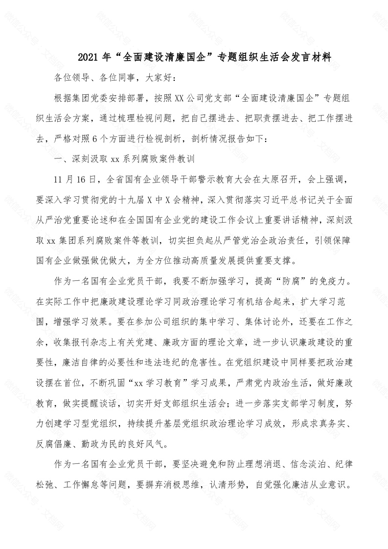 首页工作文档2021年“全面建设清廉国企”专题组织生活会发言材料