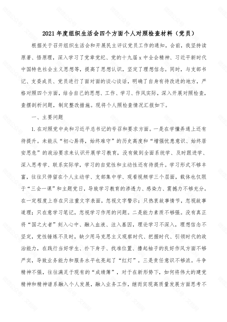 2021年度组织生活会四个方面个人对照检查材料(党员)