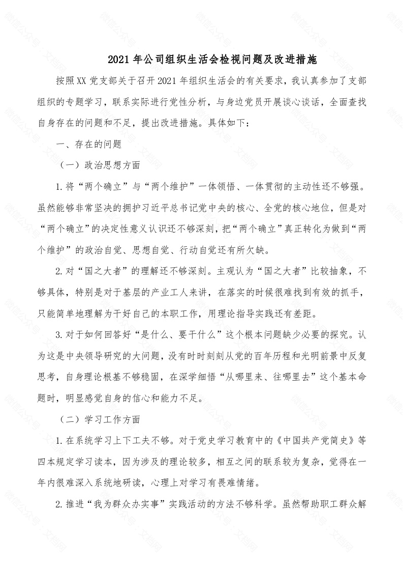 首页工作文档2021年公司组织生活会检视问题及改进措施