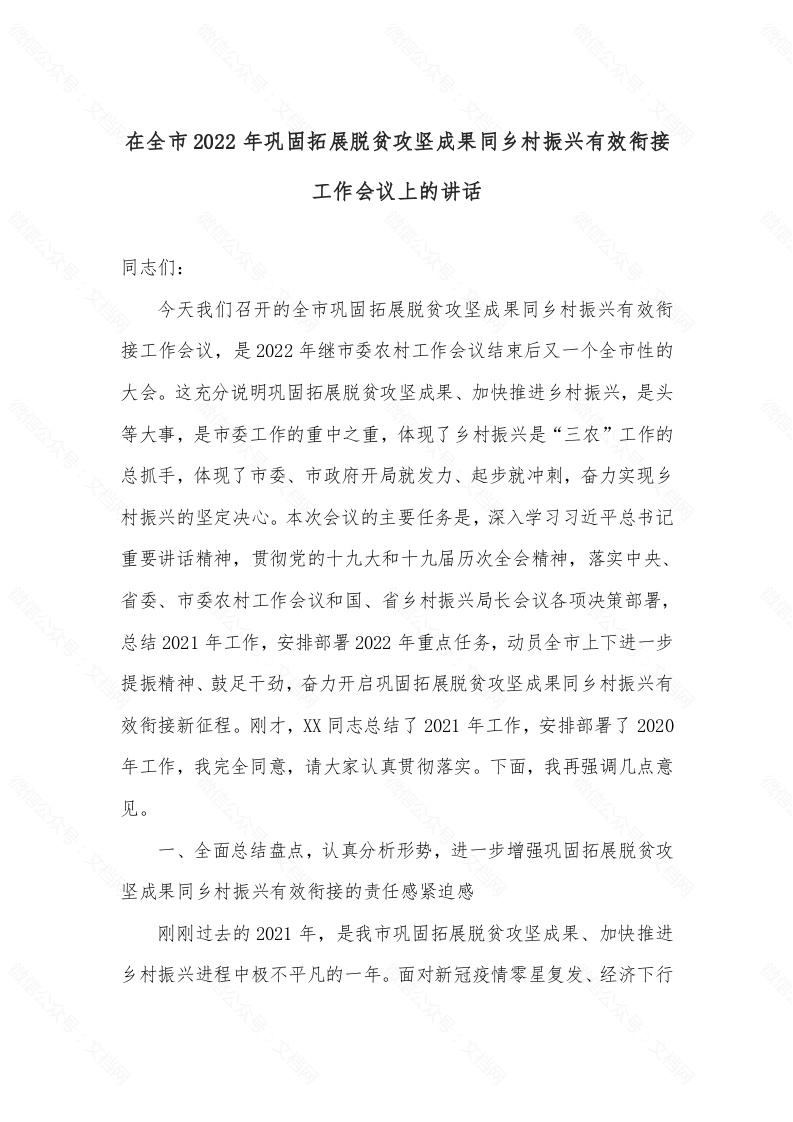 在全市2022年巩固拓展脱贫攻坚成果同乡村振兴有效衔接工作会议上的讲话