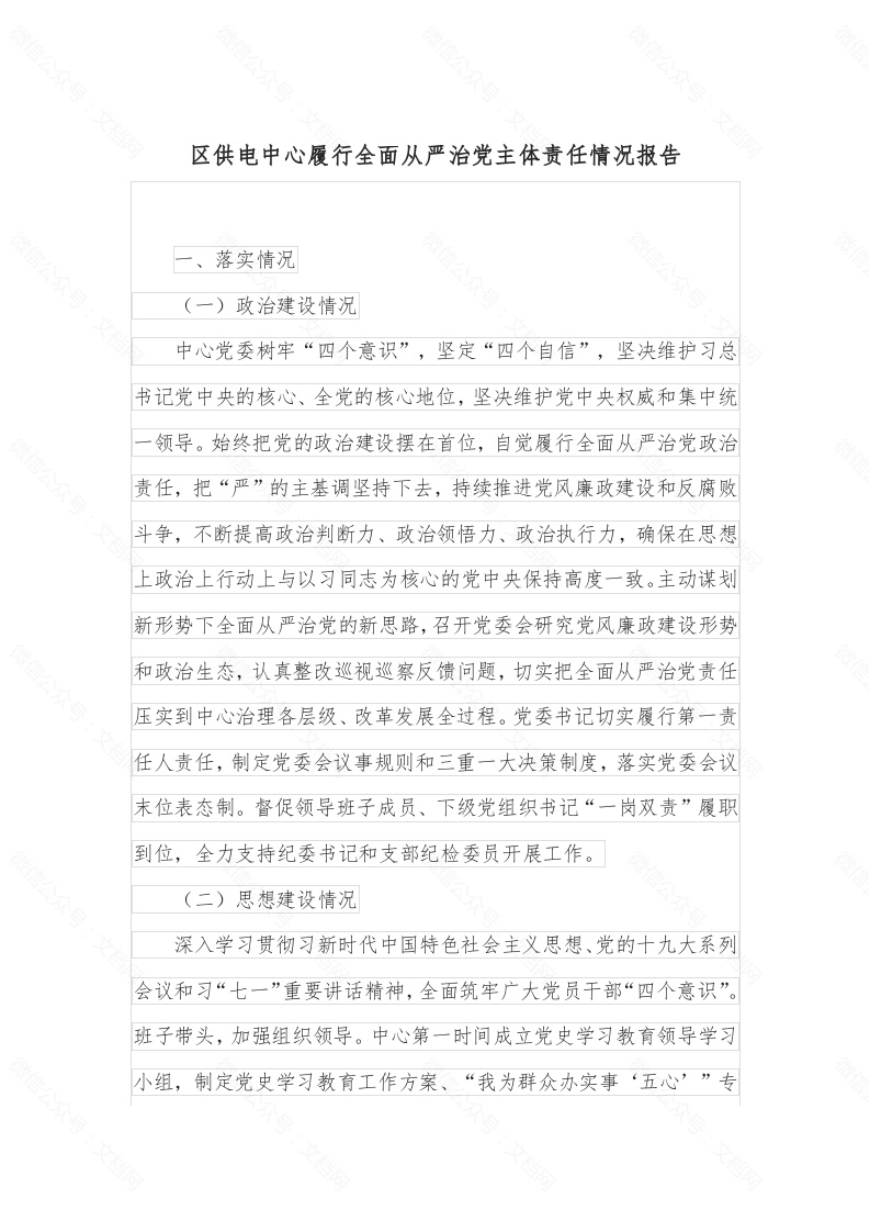 首页材料汇编区供电中心履行全面从严治党主体责任情况报告
