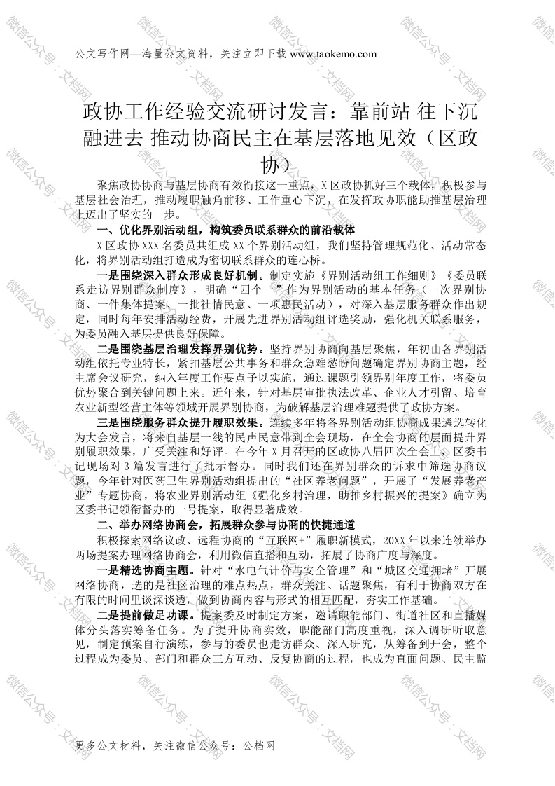 政协工作经验交流研讨发言:靠前站 往下沉 融进去 推动协商民主在基层落地见效(区政协)