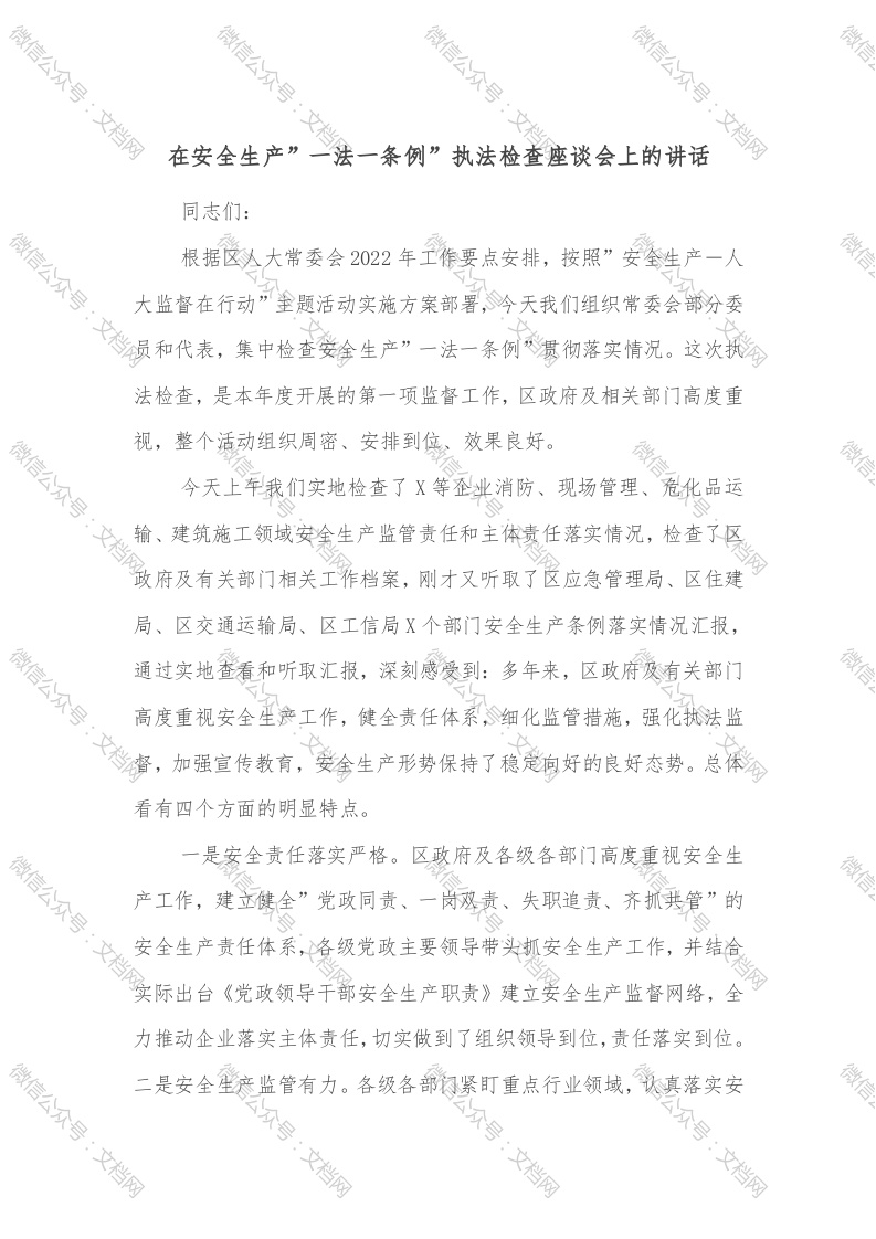 在安全生产”一法一条例”执法检查座谈会上的讲话