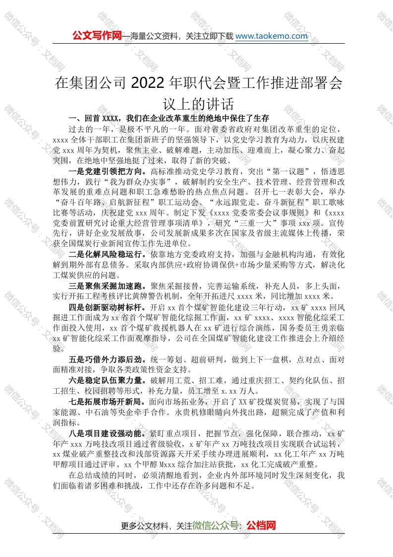 首页工作文档在集团公司2022年职代会暨工作推进部署会议上的讲话